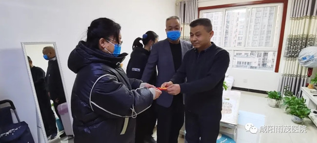 在新春佳节来临之际,为大力培育和践行社会主义核心价值观,充分发挥道德模范和身边好人的示范引领作用,2021年1月21日下午,咸阳雨茂医院院长杜治锋、执行院长冯丽萍、办公室主任刘艳等一行7人,走访慰问了咸阳市“道德模范好人”徐军超同志,为他送去了新春的祝福、慰问品及慰问金。