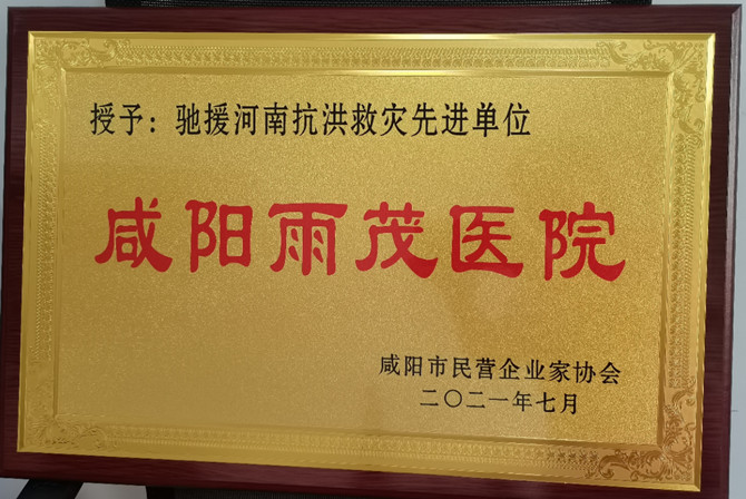 7月27日上午咸阳市民营企业家协会授予咸阳雨茂医院:“驰援河南抗洪救灾先进单位”荣誉称号!