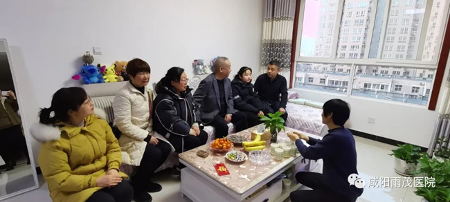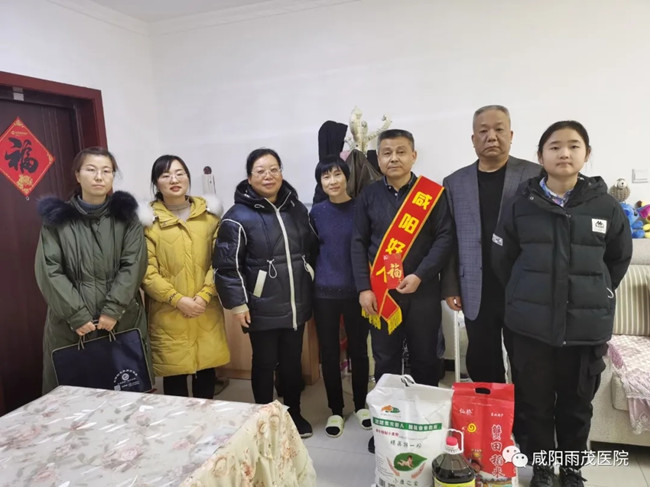 在新春佳节来临之际,为大力培育和践行社会主义核心价值观,充分发挥道德模范和身边好人的示范引领作用,2021年1月21日下午,咸阳雨茂医院院长杜治锋、执行院长冯丽萍、办公室主任刘艳等一行7人,走访慰问了咸阳市“道德模范好人”徐军超同志,为他送去了新春的祝福、慰问品及慰问金。