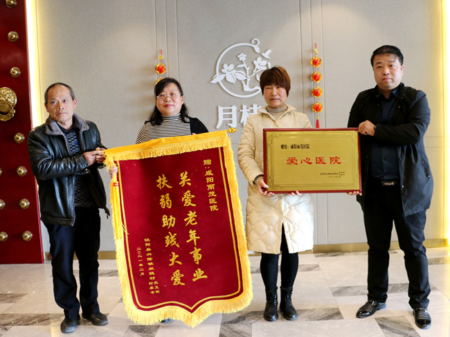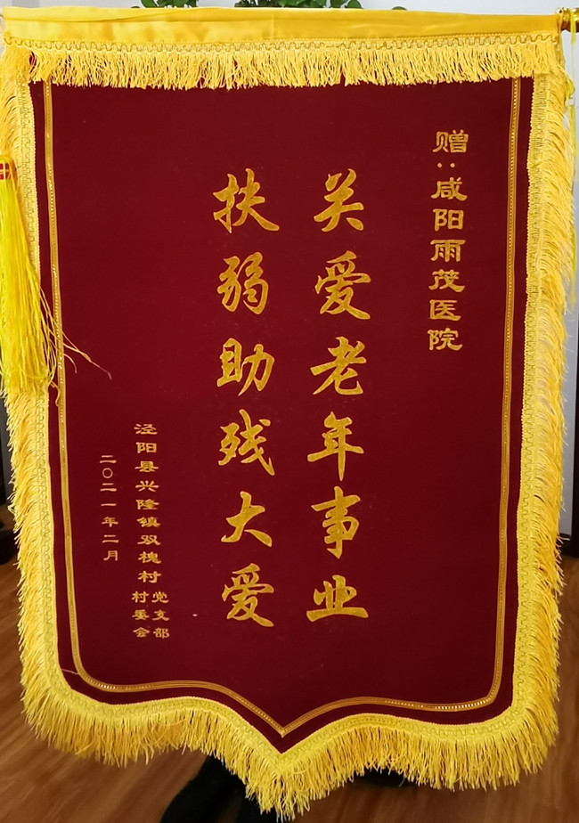 泾阳县兴隆镇双槐村党支部、村委会赠予咸阳雨茂医院“关爱老年事业、扶弱助残大爱”锦旗。