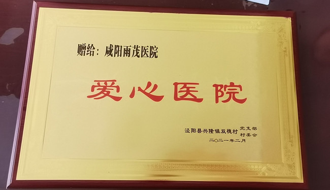 泾阳县兴隆镇双槐村党支部、村委会赠予咸阳雨茂医院“爱心医院”牌匾。